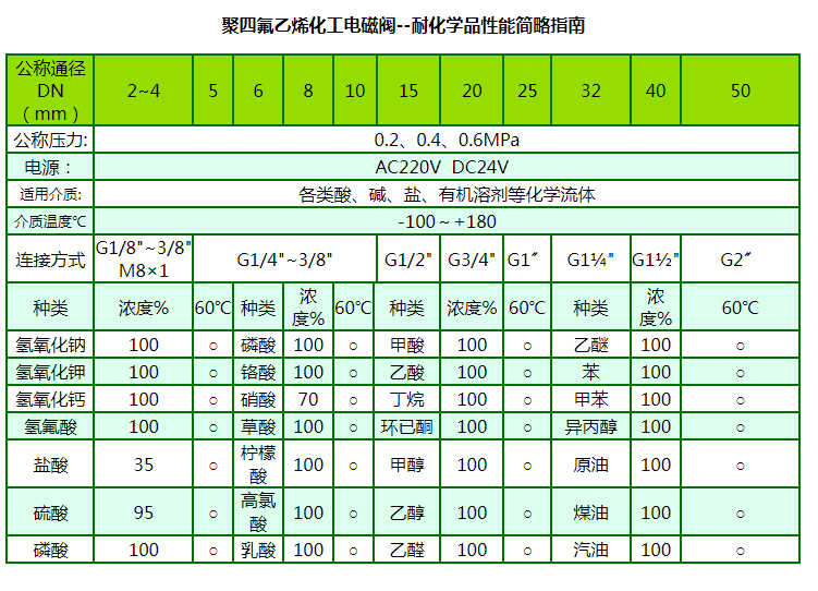 “禹成牌”化工電磁閥由于啟閉原理的獨特性和結構設計的科學性,產品的所有部件均可根據不同的化學介質選用不同的高分子材料制造,同時由于它的先導孔和卸壓孔是傳統閥的幾十倍大,復位彈簧設置在介質外,因此它具有不易堵塞、耐酸堿、抗腐蝕和使用壽命長等優點,可適應于各種化學流體介質,是化工流體自動化生產設備的最佳配套產品。