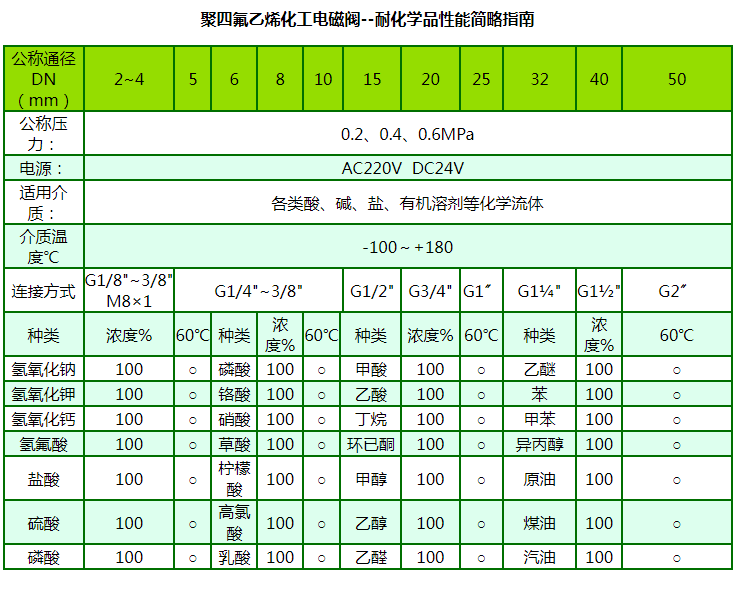 “禹成牌”化工電磁閥由于啟閉原理的獨特性和結構設計的科學性,產品的所有部件均可根據不同的化學介質選用不同的高分子材料制造,同時由于它的先導孔和卸壓孔是傳統閥的幾十倍大,復位彈簧設置在介質外,因此它具有不易堵塞、耐酸堿、抗腐蝕和使用壽命長等優點,可適應于各種化學流體介質,是化工流體自動化生產設備的最佳配套產品。