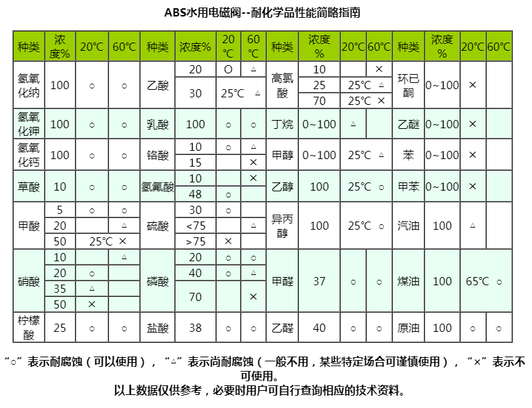 “禹成牌”水用電磁閥由于啟閉原理的獨特性和結構設計的科學性,產品的所有部件均可根據不同的化學介質選用不同的高分子材料制造,同時由于它的先導孔和卸壓孔是傳統閥的幾十倍大,復位彈簧設置在介質外,因此它具有不易堵塞、耐酸堿、抗腐蝕和使用壽命長等優點,可適應于各種化學流體介質,是化工流體自動化生產設備的最佳配套產品。